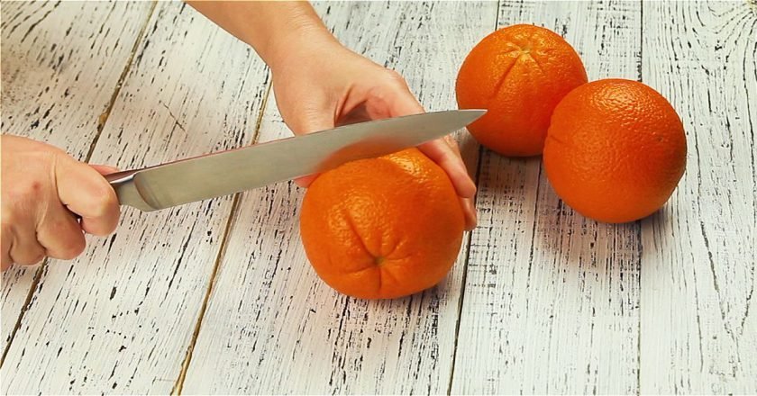 - Надрежьте апельсиновую кожуру посредине цитруса — так, как если бы вы хотели разрезать его дольки поперек.