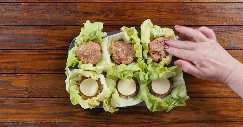 - Формы для кексов смажьте сливочным маслом, выложите туда капустные листы. Из фарша скатайте шарики и поместите их в формы, сверху выложите по кусочку моцареллы, а затем снова слой фарша.