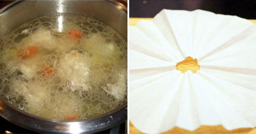 Теперь нужно замерить размер картуша от центра кастрюли. Сделайте закругленный срез в более широкой части изделия. Маленький срез сделайте в тонкой части изделия. Разверните картуш. Вот и готово! Разместите картуш прямо на поверхности бульона, рагу или соуса.