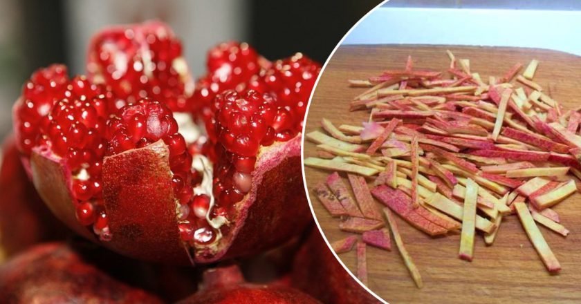 - Почистите гранат так, как будто это картофель. Затем нарежьте шкурки полосками шириной в три-четыре миллиметра.