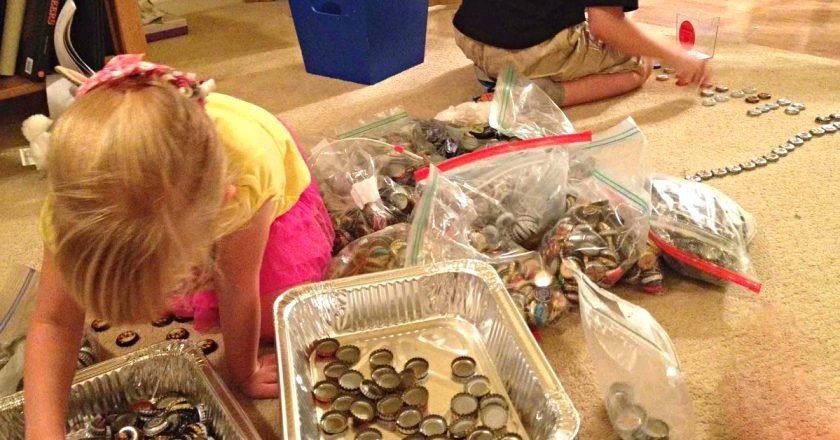 В назначенный день икс дети с энтузиазмом взялись за сортировку материала. Схожие по оттенку крышки они разложили по отдельным контейнерам. Уже на тот момент у Криса вырисовался замысел особой выкладки крышечек.
