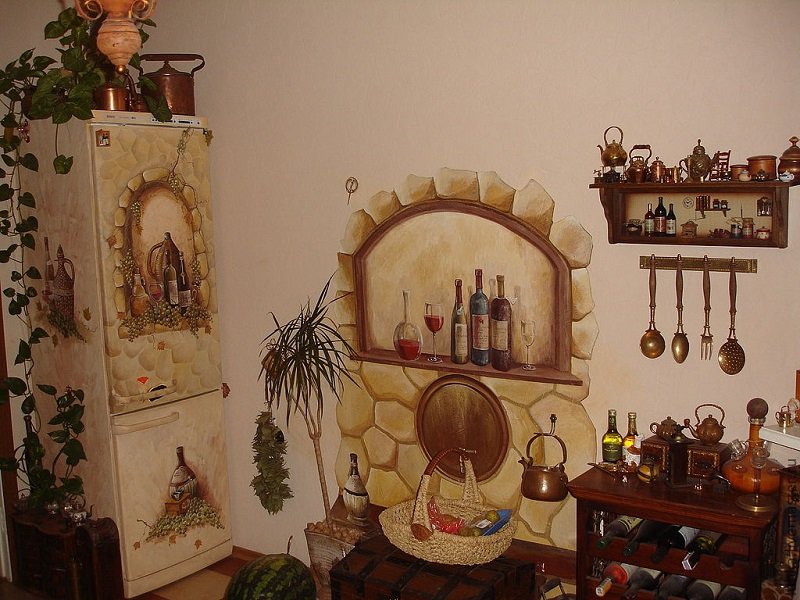 Декупаж поможет создать эффект винтажной отделки. Такой холодильник будет идеально гармонировать с другими элементами декора в технике декупаж: разделочными досками, тарелками, вазами. Единственная сложность заключается в том, что для этого необходимо уделить большее количество времени, чем для реализации любой другой идеи.