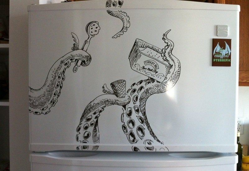 Самый практичный, доступный и легкий вариант — маркеры. Во-первых, так в украшении холодильника сможет принять участие любой желающий. Во-вторых, маркер легко удаляется спиртом с гладких поверхностей. Можно радовать себя новыми рисунками хоть каждый день!