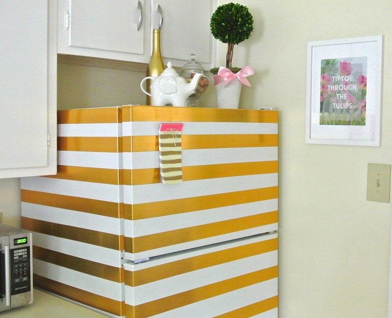 Да, клеить на холодильник можно абсолютно всё, так почему не взять в оборот самое простое средство? Конечно, хозяйственный скотч вряд ли кого-то порадует, а вот декоративный точно не оставит равнодушным. В полоску, клеточку, целиком или частично скотч отлично ляжет на поверхность холодильника и, что самое главное, его потом будет легко снять.