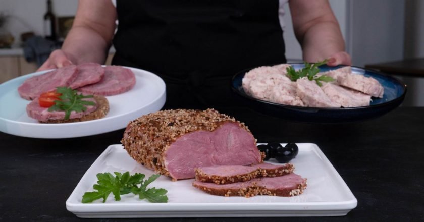 - Хорошенько перемешайте массу вручную. С помощью жестяной банки и пакета для запекания сформируйте колбаску. Хорошо упакуйте ее и запекайте в разогретой до 100 °C духовке 2 часа.