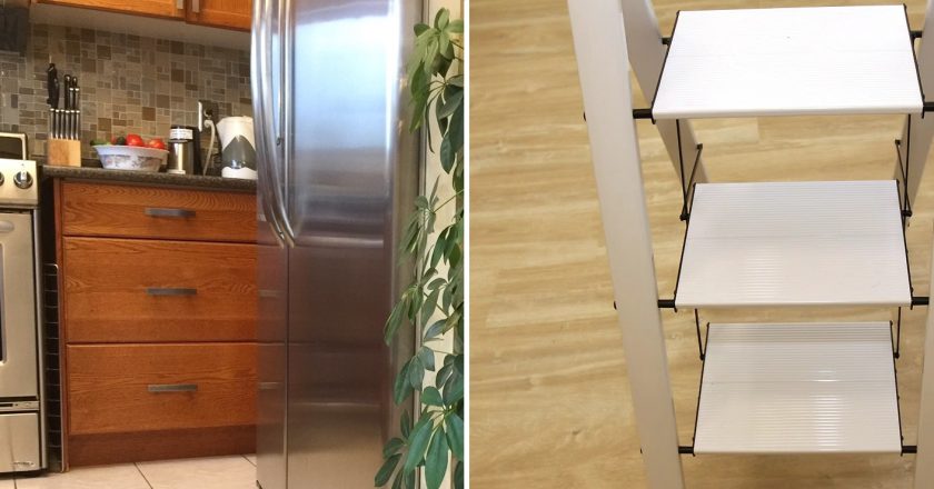 С первого взгляда может показаться, что такой громоздкой вещи не место на кухне. Это не совсем так, и лестница чуть ли не лучшее решение практически для каждой комнаты. В случае с кухней всё просто: ступени образовывают полки, на которые очень удобно складывать кастрюли, вместо того, чтобы копаться в глубинах шкафов и ящиков.