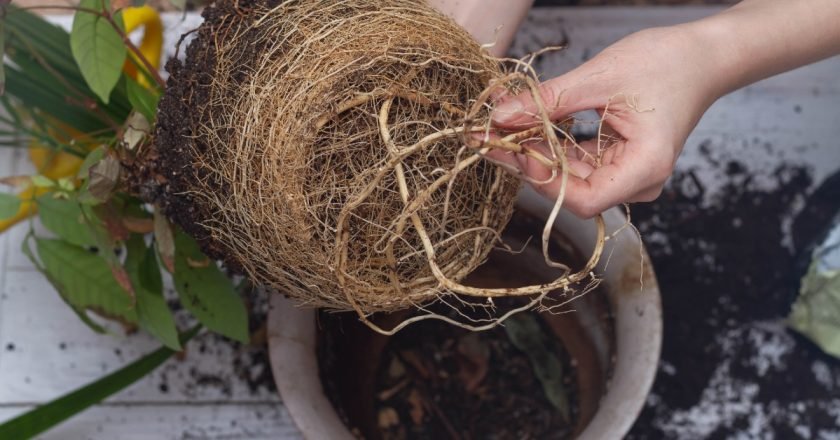 Пересадка комнатного растения — отличная возможность осмотреть его корни. Аккуратно распутайте их при необходимости и очистите от старой земли. Если корни запутаны так сильно, что вы не можете с ними справиться, следует их немного подрезать. Так ваш вазон будет лучше расти в новом горшке.