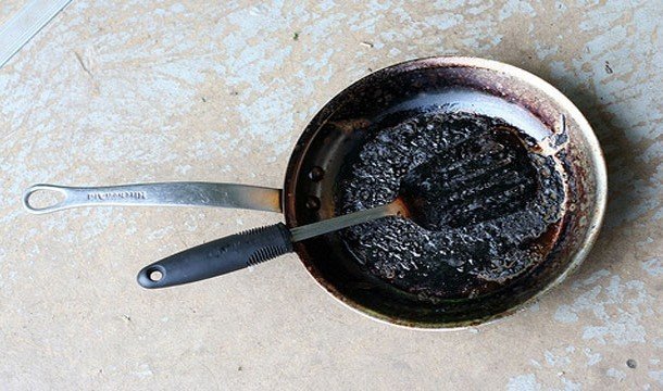 - Чтобы отчистить любые загрязнения со сковороды, достаточно налить в нее уксус и разогреть. В особо трудных случаях можно воспользоваться пищевой содой.