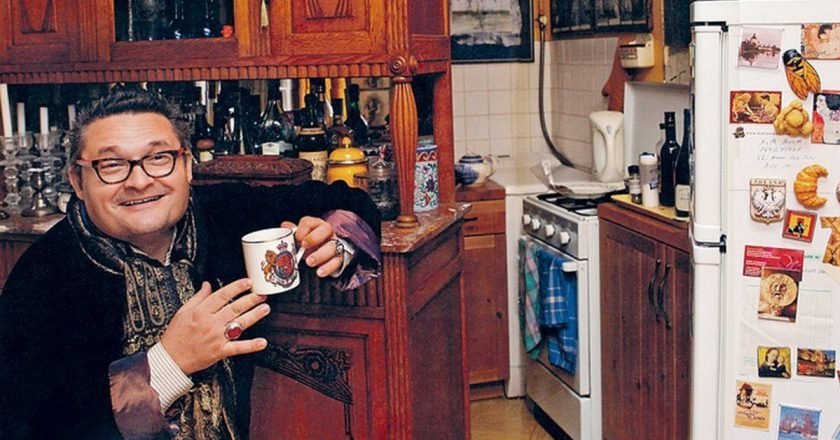 Кухня Александра Васильева оформлена в спокойных коричнево-песочных оттенках. Мебель для нее сделана из дорогого дерева с изящными резными вставками. На стенах — снова портреты, на шкафах блестят натертыми боками старинные самовары. Сама кухня крошечная, но уютная.
