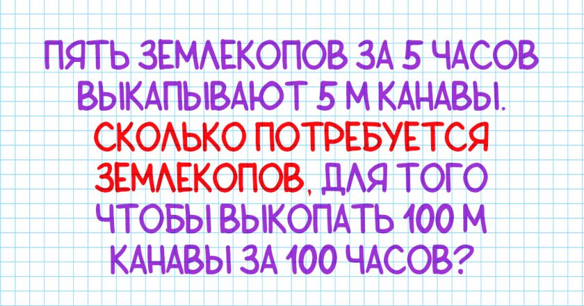За 5 часов 5 землекопов могут выкопать 5 м канавы. А сколько нужно землекопов, чтобы за 100 часов выкопать 100 м канавы?