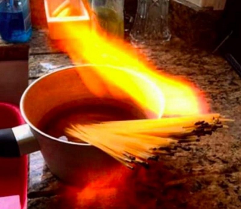 Если поставить спагетти на большой огонь, они успеют обуглиться прежде, чем сложиться в кастрюлю. Однако владелец этой кастрюли явно просто перепутал конфорки и поставил ее на соседнюю…