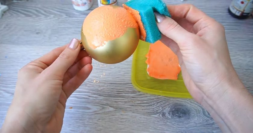 Затем нанесите получившуюся краску губкой на шар. Верхушку можно не закрашивать, там будет шапочка. Просушите первый слой феном, потом нанесите второй и еще раз просушите.