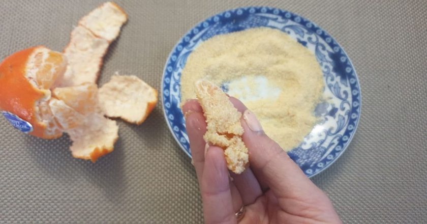 Вам понадобится всего два ингредиента: мандарин и манка. Очистите фрукт от кожуры и отделите одну дольку. Снимите с нее пленочку и удалите семена.