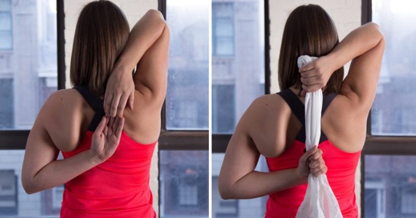 Если не получается зацепиться пальцами за спиной, используйте полотенце. Возьмите один конец полотенца правой рукой и заведите ее за голову. А левой рукой ухватитесь за второй конец полотенца там, где можете достать.