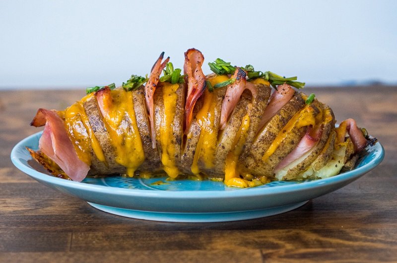 Картошка гармошкой удобна в приготовлении и выглядит аппетитно на любом столе. С чем ее только не готовят: просто с сыром, с маслом и зеленью, грибами, помидорами и всем, что можно тонко нарезать и положить в надрезы. Фаворитом среди всех сочетаний остается тандем сыра и ветчины, который в картофеле смотрится намного эффектнее, чем в сэндвиче.