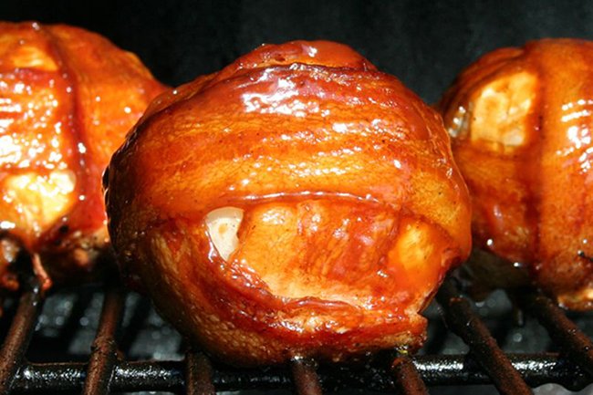 - 4Оберните заготовки для мячиков тремя ломиками бекона. Бекон закрепите зубочистками.