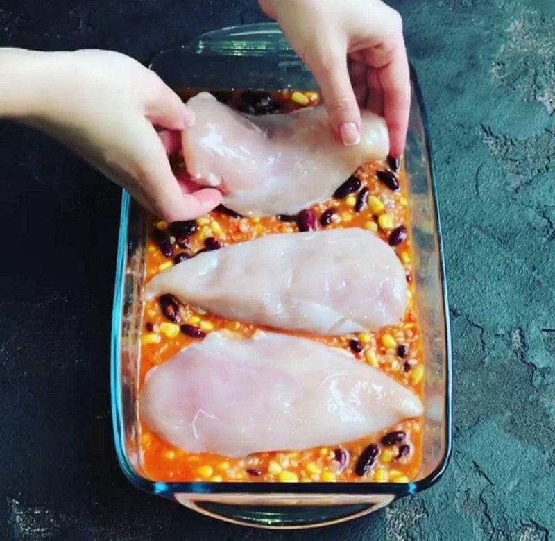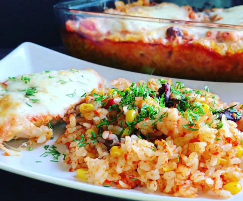 Редакция «Со Вкусом» находит это блюдо совершенным: идеальное второе с сочной запеченной курицей и пропитавшимся ее ароматом рисом. На выходе получится в меру поджаренная сверху курочка с уже готовым гарниром. Одно из самых главных достоинств этого мексиканского рецепта — время приготовления. Каких-то 5 минут на приготовление! Остальное время уходит на запекание.