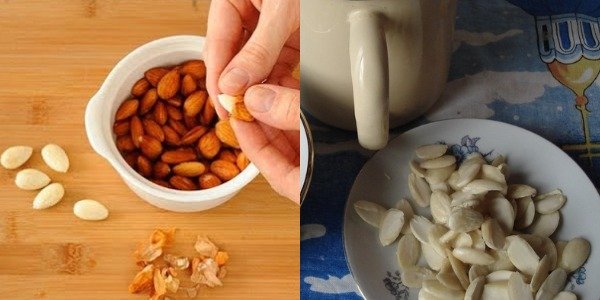 - 1Возьмите около половины цельного миндаля (грамм 60), поместите его в кастрюлю, залейте водой и доведите до кипения. Затем остудите и очистите миндаль от кожуры и разрежьте каждую миндалину пополам острым ножом.