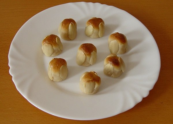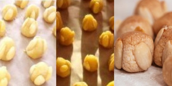 - 3Достаньте тесто и, отщипывая от него небольшие кусочки, сформируйте небольшие печенюшки, придав им округлую форму (диаметром 2–3 см). Выкладывайте их на противень, выстланный пергаментом и смазанный сливочным маслом. На каждый «шарик»поместите вертикально по 2–3 миндальных половинки, осторожно прижмите.