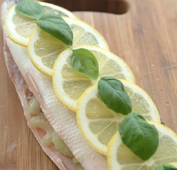 - 4Нарежьте лимон слайсами. Выложите их на рыбу вместе с базиликом.