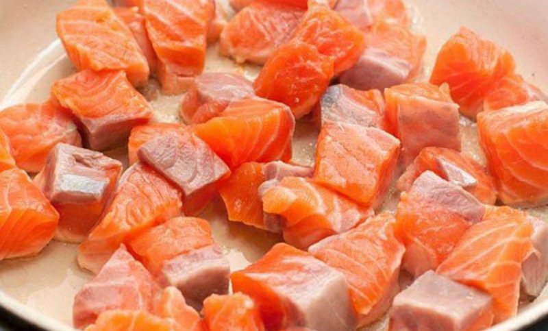 - 3Лосось нарежьте ломтиками толщиной около 1 см. Посолите, поперчите с обеих сторон. Быстро обжарьте со всех сторон на антипригарной сковороде без добавления масла. Готовую рыбу остудите.