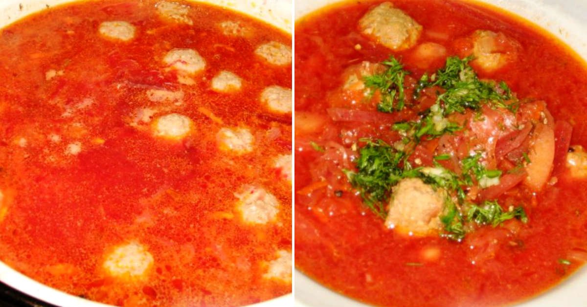 В моей памяти это самое сытное первое блюдо. Даже солянка ему уступает. А все из-за того, что готовится сибирский борщ с фрикадельками и фасолью на мясном бульоне. Муж говорит, что после тарелки такого борща даже ко второму приступать не хочется. Есть в его словах доля правды.
