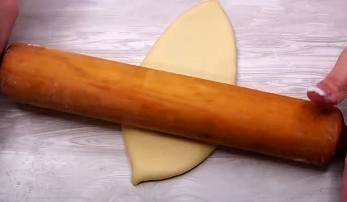 - 4Затем достаньте тесто, разделите его на порции и приступайте к лепке пирожков. Раскатайте кусок теста, положите на него начинку, защипните по краю и снова раскатайте. Должна получиться форма лаптя.