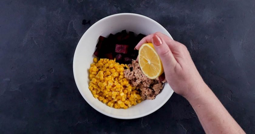 - Добавьте к свекле кукурузу, тунец, зелень, полейте лимонным соком и оливковым маслом. Перемешайте салат.