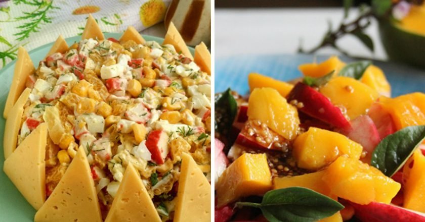Этот салат получается достаточно сытным за счет крабовых палочек или крабового мяса, яиц и сыра. Но не беспокойтесь, что салат будет очень тяжелым: в нем еще присутствуют легкая кукурузка и кисловатый апельсин. Такое поистине королевское угощение требует соответствующего оформления!