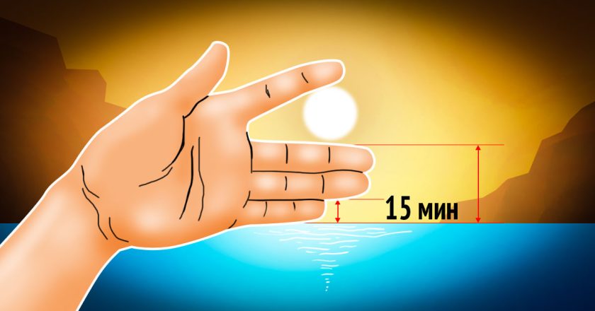 Конечно, у всех сейчас есть современные гаджеты, которые точно показывают время захода солнца. Но что, если вы решили отдохнуть без телефонов и насладиться природой? Определить, когда зайдет солнце, очень просто! Поднимите руку и расположите ладонь горизонтально таким образом, чтобы солнце касалось указательного пальца. Каждый ваш палец от солнца до горизонта — это 15 минут. Таким образом, если помещается только два пальца, до захода солнца осталось полчаса, если три — 45 минут. При надобности можно поставить и вторую руку.