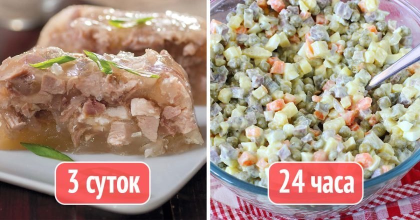 И еще одно блюдо, не менее популярное в новогоднюю ночь, — холодец. Конечно, это не салат, но часто возникают вопросы по поводу сроков его годности, потому что, как правило, эта закуска остается после торжества. Холодец может простоять до 4 суток. Настоящий рекордсмен!