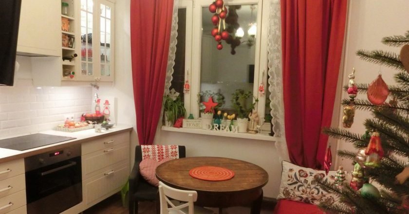Однако всё в меру. Помните, что количество праздничного декора должно быть сопоставимо размерам вашей кухни. Размах уместен только на больших просторах. Если ваша кухня в пределах 5–10 м², вполне достаточно украсить лишь окна и шкафчики. Ну и, конечно, всегда приветствуется сервировка стола нарядной скатертью и подсвечниками.