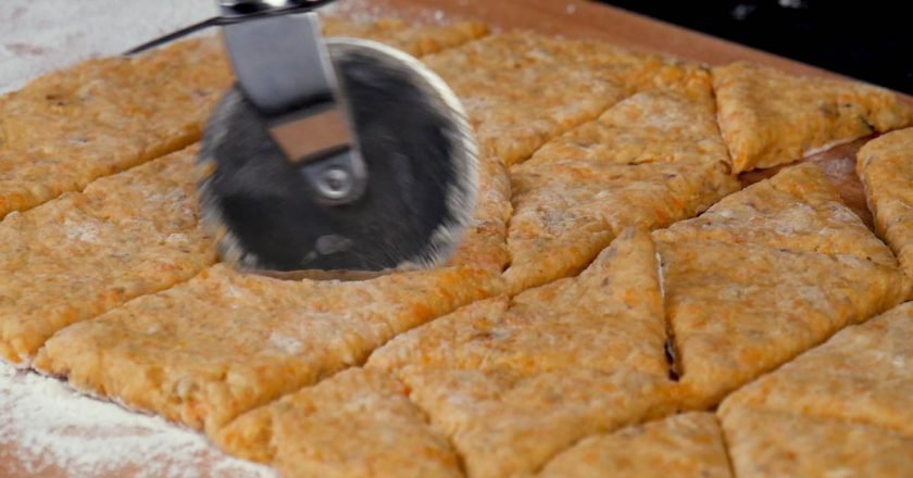 - Выложите тесто на рабочую поверхность, посыпанную мукой, и раскатайте в прямоугольный пласт. Разрежьте его на треугольники или ромбы.