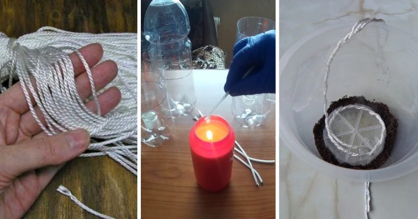 - Отрежьте от любой синтетической веревки кусочек длиной 15–18 см. Обмотайте посередине целлофановым пакетом, чтобы земля не сыпалась через открытое горлышко бутылки. Нижняя часть фитиля должна оказаться в воде, а верхняя впоследствии будет находиться в земле.