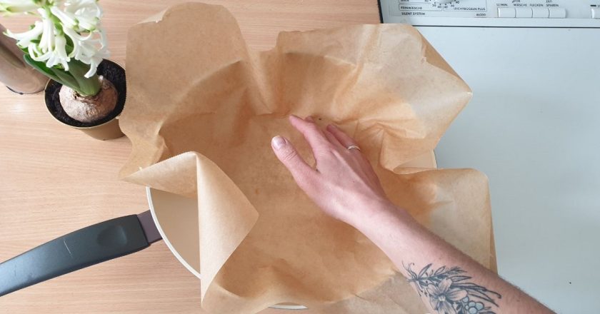 - На сковороду выкладываем пергамент в один слой, закрывая им дно и стенки. Разогреваем сковороду на небольшом огне.